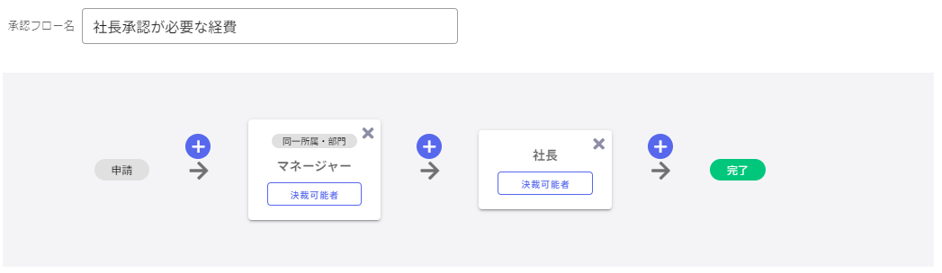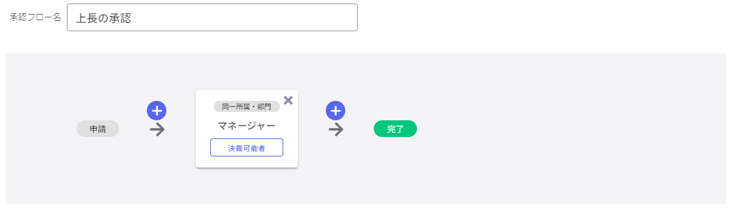「申請者と同じ所属・部門のマネージャーが承認した後」に「社長が決裁する」承認フローを登録する場合、以下のように設定してください。