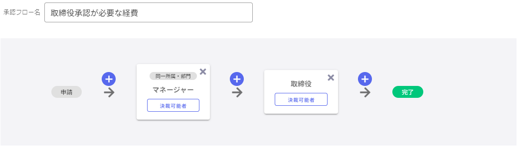 「申請者と同じ所属・部門のマネージャーが承認した後」に「取締役が決裁する」承認フローを登録する場合、以下のように設定してください。