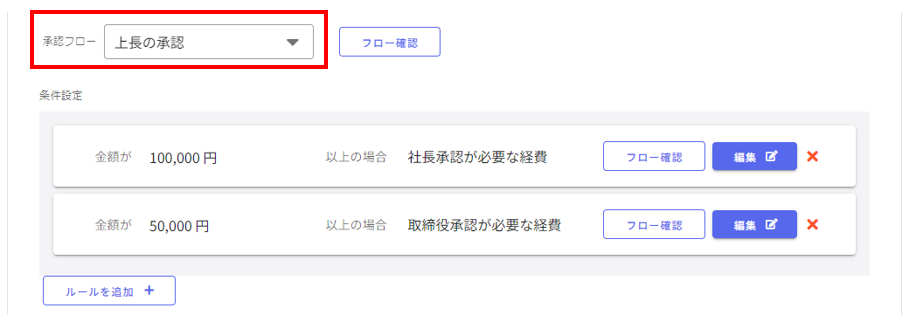 設定したルールに当てはまらない申請の場合は、「承認フロー」で選択した承認フローが適用されます。