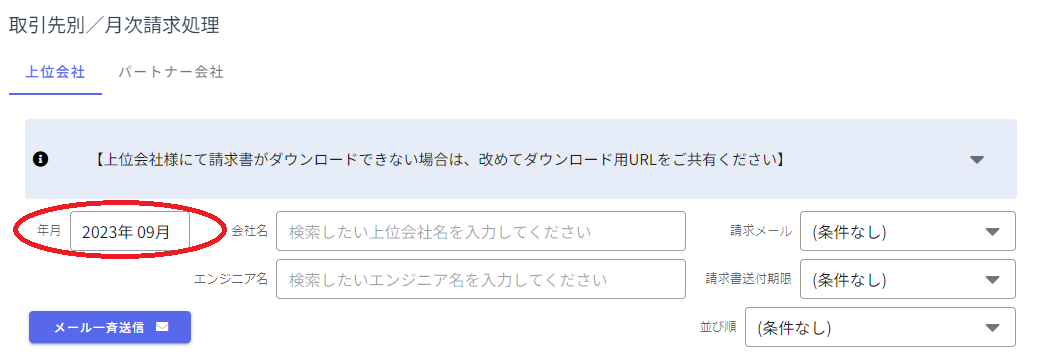 メニューバー「案件管理」>「取引先別/月次請求処理」をクリックします。
