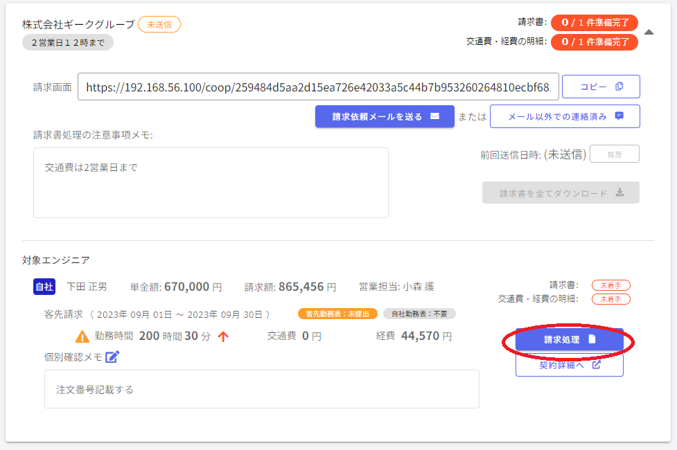 明細を作成するエンジニアの「請求処理」ボタンをクリックしてください。