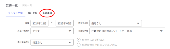 メニューバー「案件管理」>「契約一覧」に「承認申請」タブが追加されます。