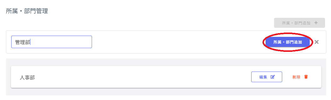 「所属・部門追加+」をクリックして任意の名称を入力します。