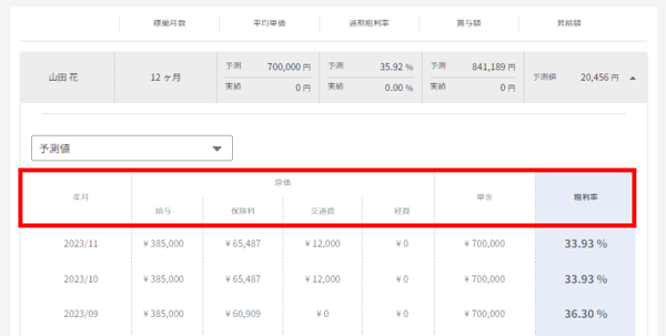 粗利率表(予測値)では、以下項目の予測値が確認できます。